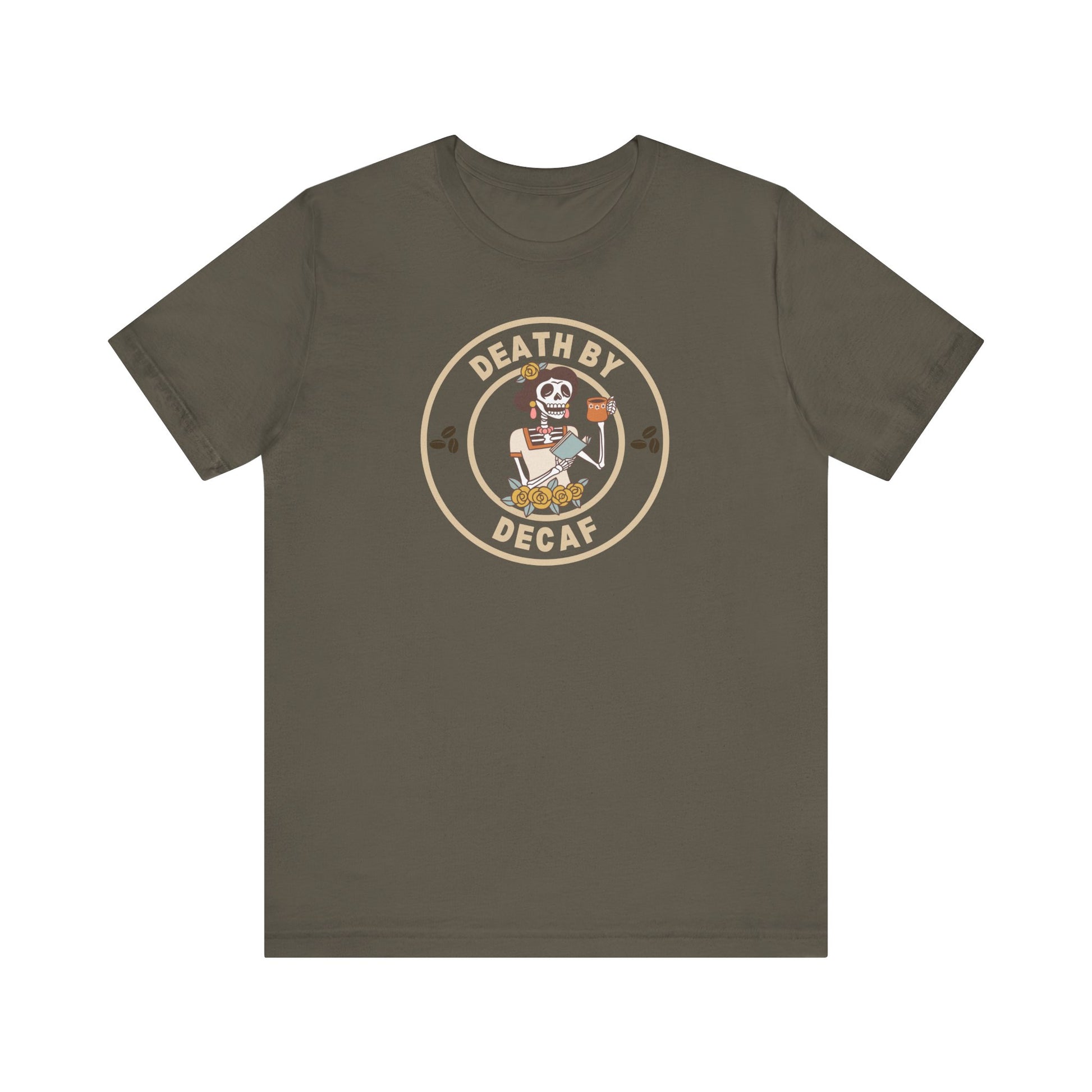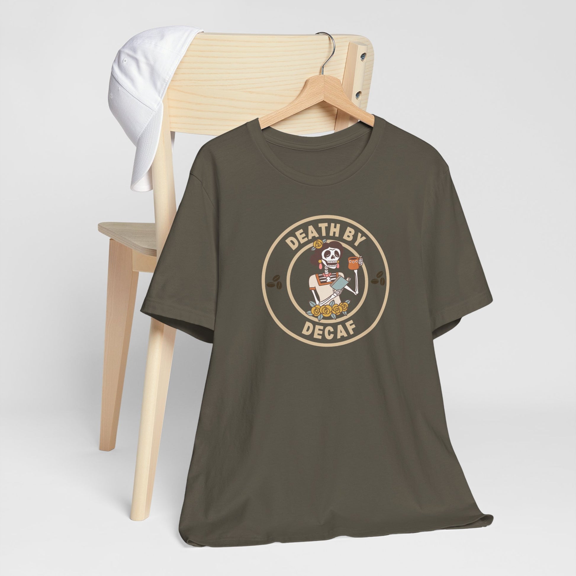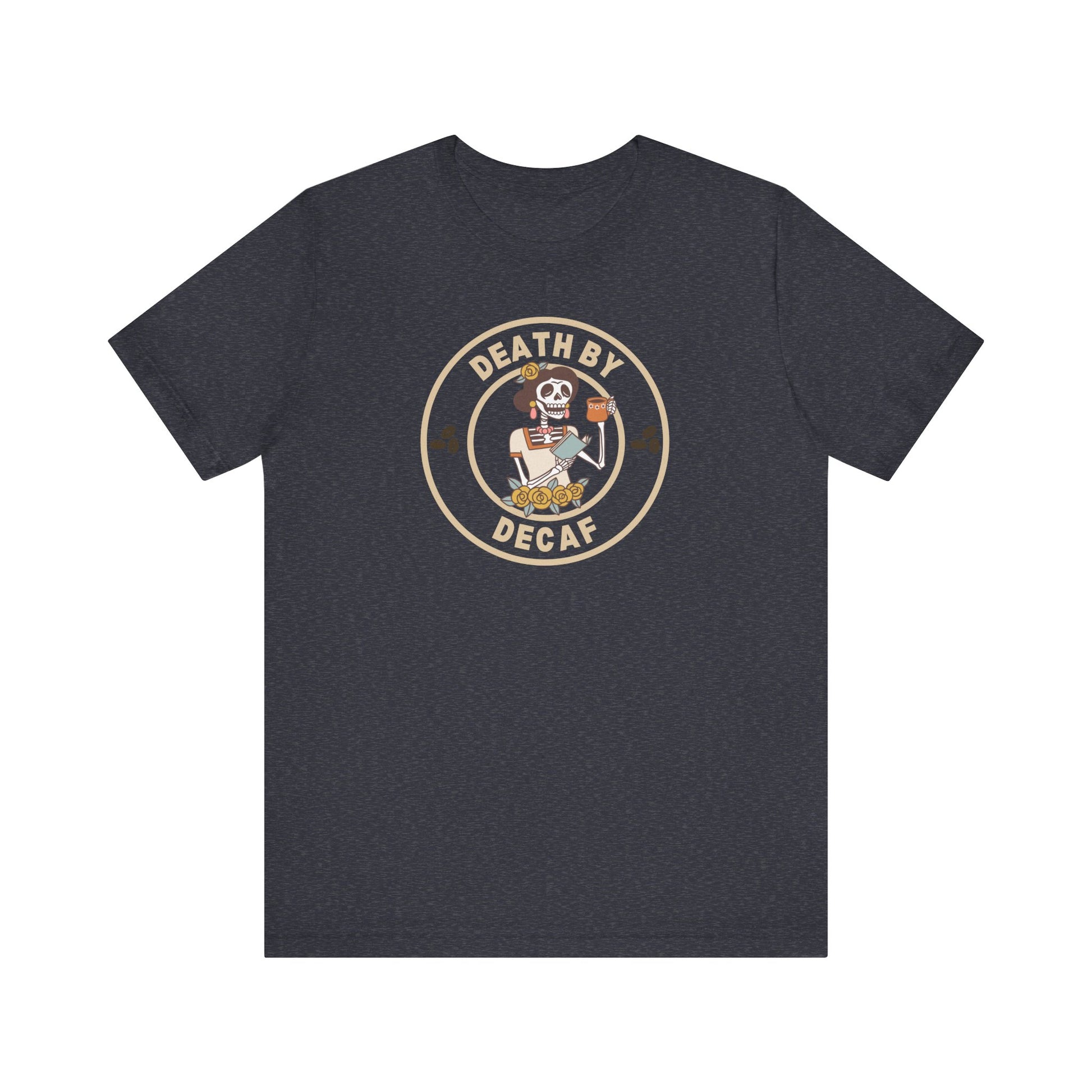 - Laugh Out Loud: Featuring the witty "Death by Decaf" slogan, this shirt is guaranteed to bring a smile and a chuckle to those around you.