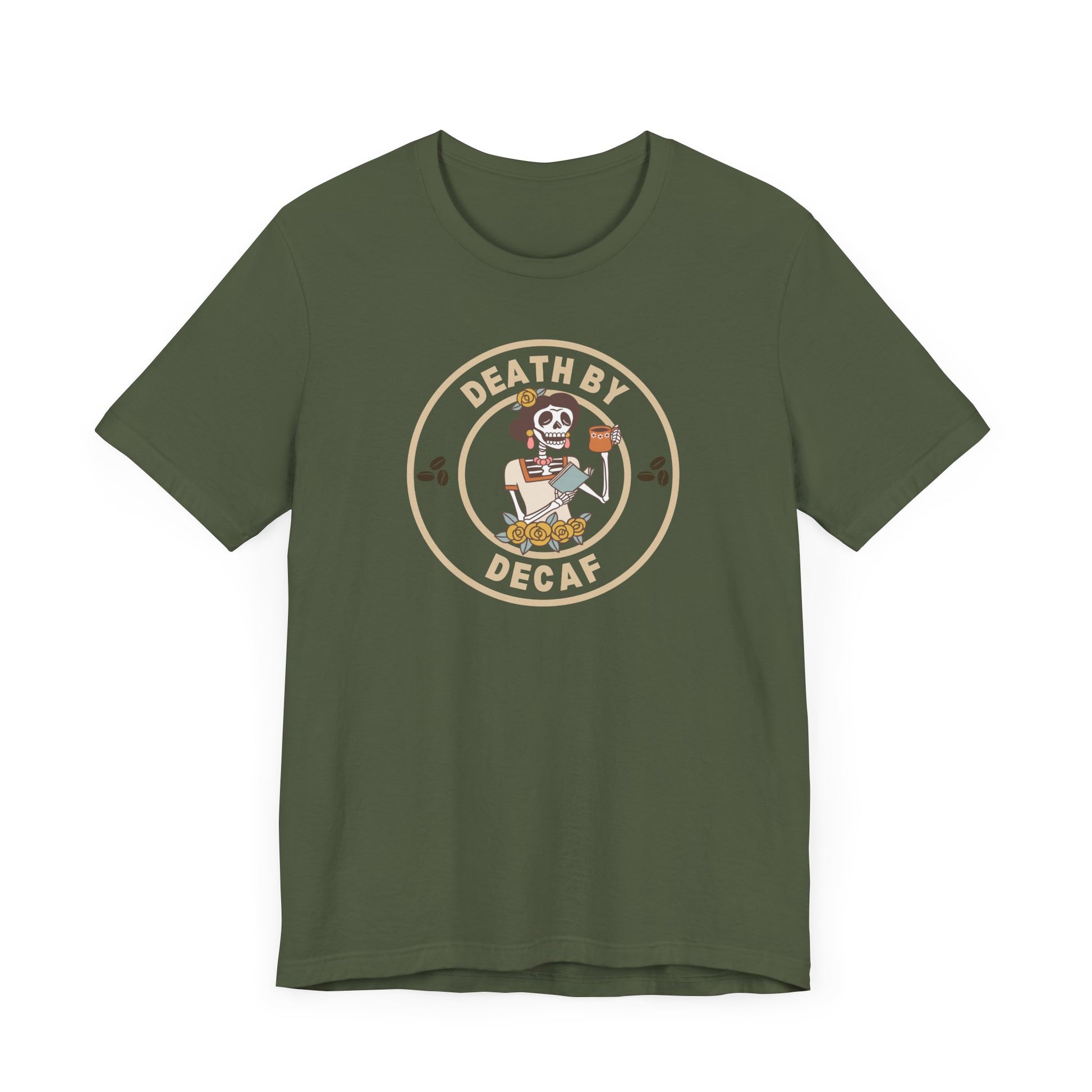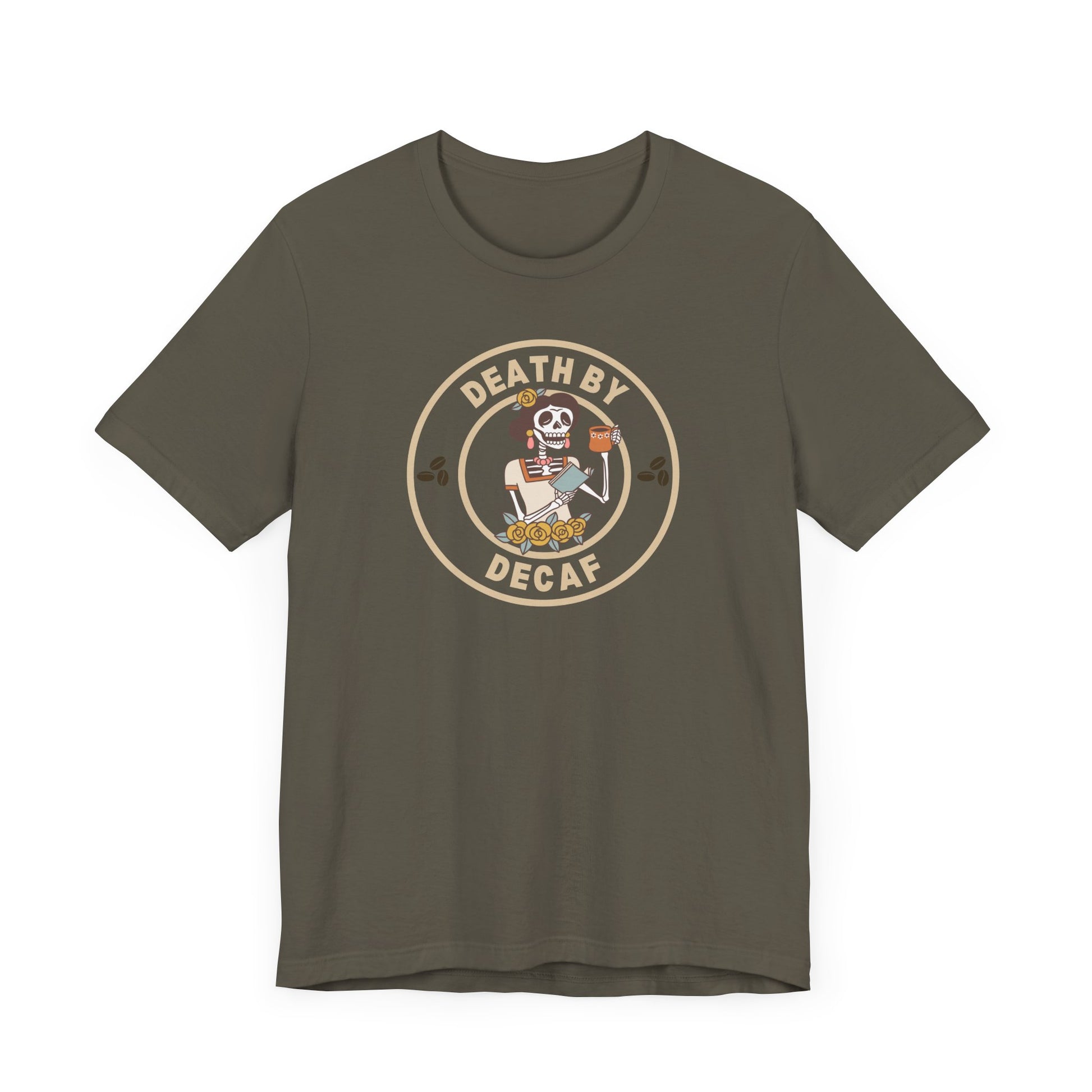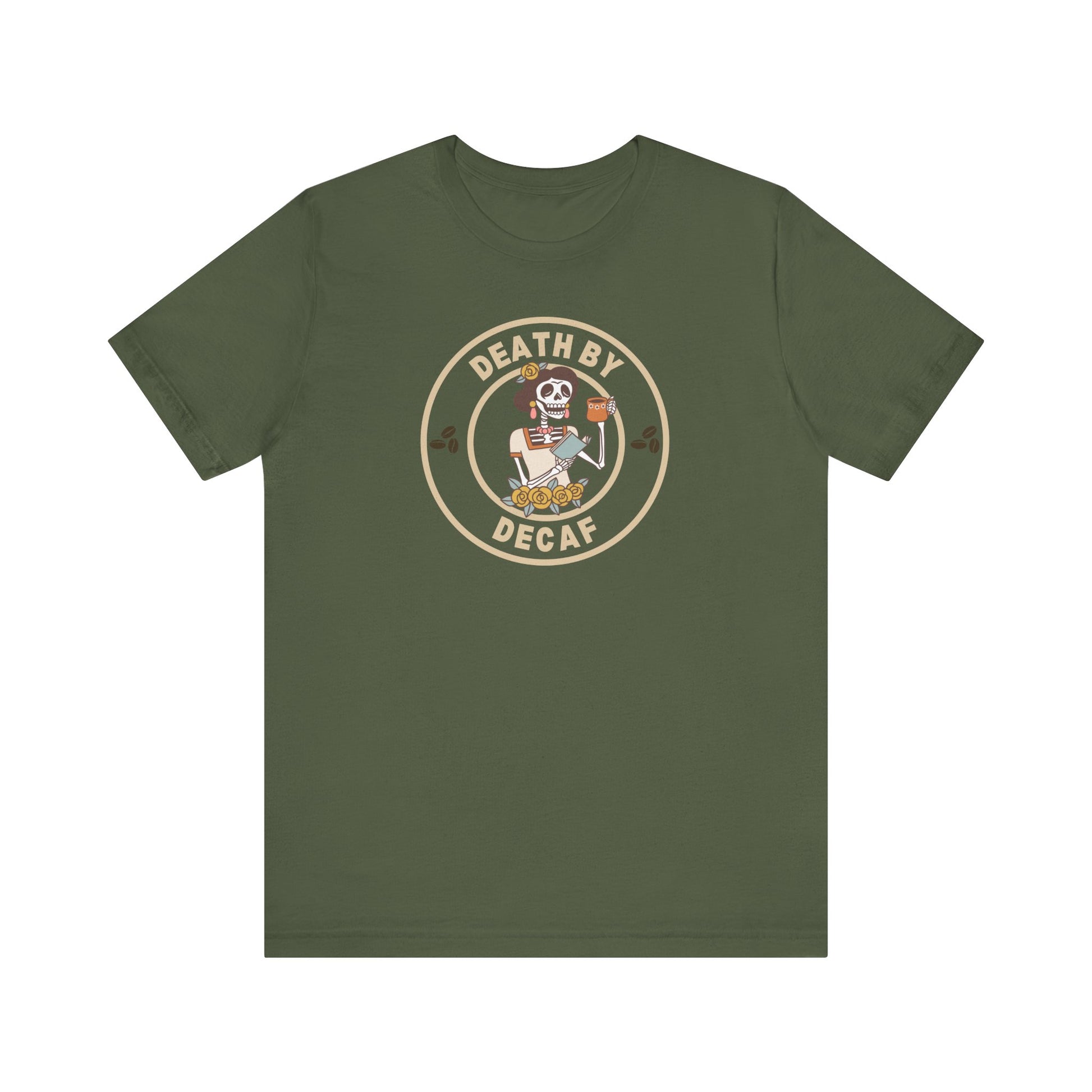 - Laugh Out Loud: Featuring the witty "Death by Decaf" slogan, this shirt is guaranteed to bring a smile and a chuckle to those around you.